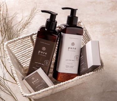 Carefully selected personal care products. Shampoo, Bath Gel, and Soap of the Pure brand, by Lousani. These are vegan-friendly luxury botanics produced in Portugal.