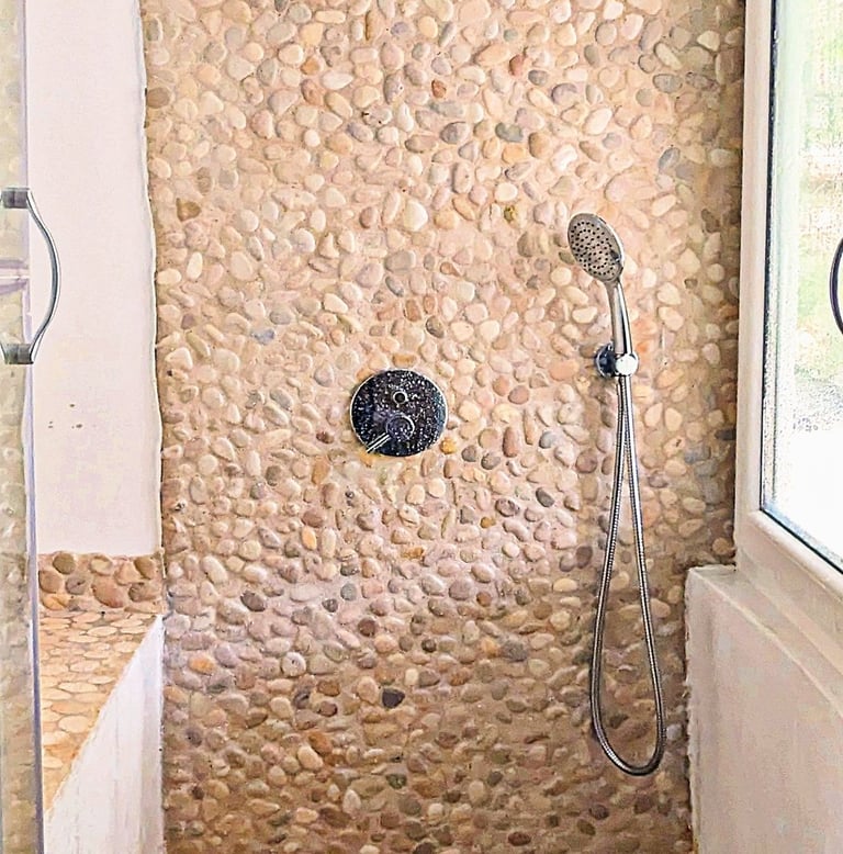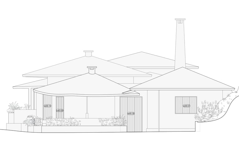 The house has 2 bathrooms, occupying a space where simplicity and functionality meet. Both bathrooms are equipped with showers. One of the showers features a spacious glass compartment complemented by a large window that frames a view to the outside. The large window was designed to ensure privacy, allowing a clear view from the inside, but not from the outside.