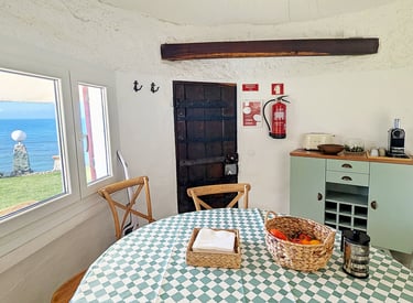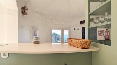 Welcome to the "Lion's Mane" Mushroom which was built to include a space for the kitchen and enrich both culinary experiences and holistic health (much like the rejuvenating essence attributed to the Lion's Mane). Centrally positioned, a sleek glass table invites communal dining. Dual doors open to the garden, establishing a seamless flow to nature, while a window affords a picturesque seascape, infusing the space with natural light.