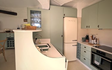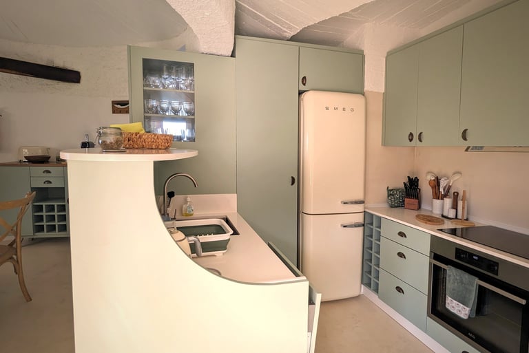 The kitchen has modern appliances for gastronomic explorations. A state-of-the-art SMEG refrigerator provides space for fresh ingredients. The sleek oven is ready to bake, and roast, while the built-in microwave above ensures convenience for quick, efficient cooking. With these tools at hand, the kitchen becomes an epicurean's playground for creating nourishing, delicious meals.