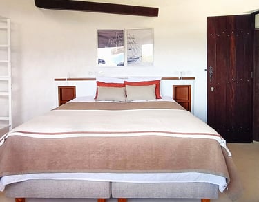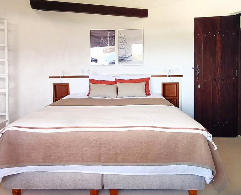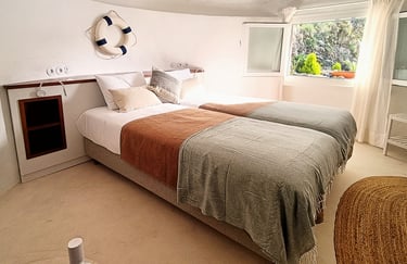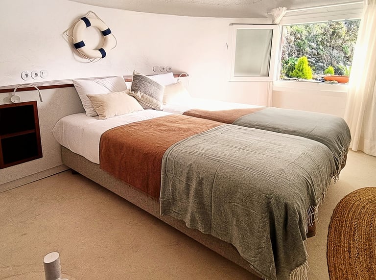 Upon entering, you are greeted by two beds, each positioned in front of a window that frames a stunning view of the sea. This window bathes the room in natural light and provides a mesmerizing, ever-changing seascape that adds a sense of tranquility and depth to the space.