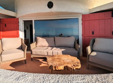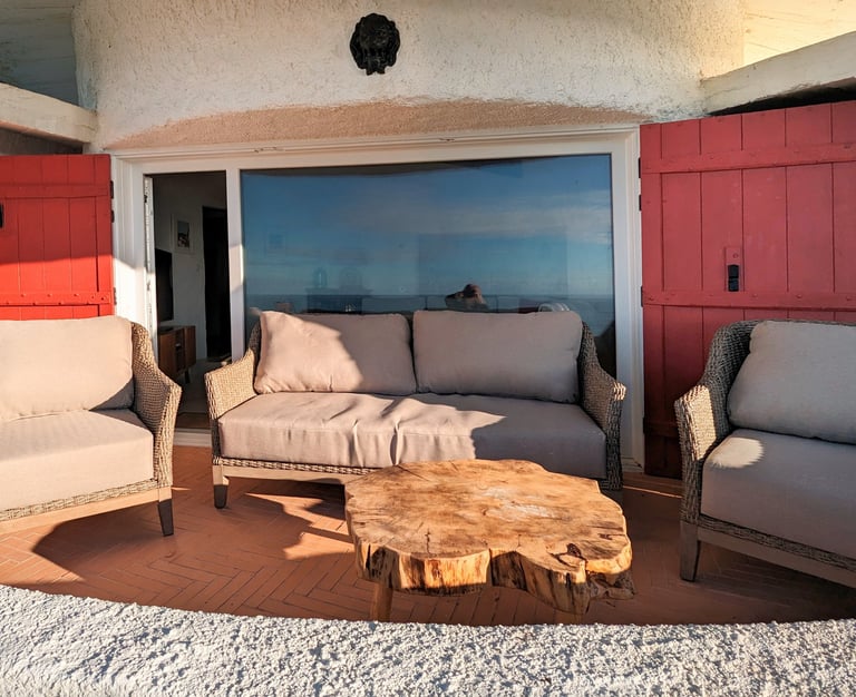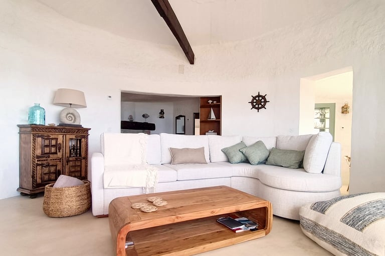 Welcome to our Living Room, inspired by the "Clavulinopsis sulcata" Mushroom (also known as "Orange Coral"). Coastal comfort meets the endless horizon here. A grand window opens to a balcony where the pristine white sofa provides unrivaled ocean views. Enjoy the golden serenity of sunsets that unfold right before you. Maritime accents and a sturdy wooden coffee table enhance the room's peaceful, oceanic vibe.