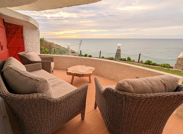 The balcony offers a comfortable outdoor setting, perfect for relaxation. It is furnished with wicker chairs and a sofa. The natural beauty of the scene is heightened by the sweeping views of the ocean, visible over a well-maintained hedge that lines the balcony's perimeter. This space is well-suited for enjoying the peaceful ambiance, the sound of the waves, or the changing colors of the sky at dusk.