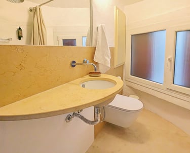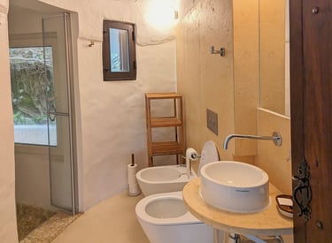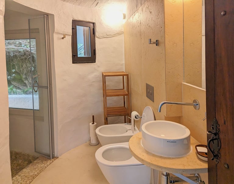 Additionally, each bathroom features a small window, inviting natural light. Both bathrooms have additional small windows connecting with the exterior to provide natural light while maintaining the intimate atmosphere of your personal retreat.