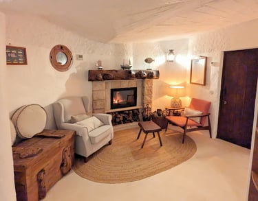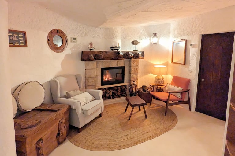 You can also step into this intimate living space, centered around a charming stone fireplace, inviting you to unwind with the soothing crackle of a fire. This room features a plush armchair and a rustic wooden chest that doubles as a side table. This room is ideal for tranquil evenings and heartfelt conversations.