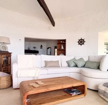 Welcome to our Living Room, inspired by the "Clavulinopsis sulcata" Mushroom, also known as the "Orange Coral" suite. Coastal comfort meets the endless horizon here. A grand window opens to a balcony where the pristine white sofa provides unrivaled ocean views. Enjoy the golden serenity of sunsets that unfold right before you. Maritime accents and a sturdy wooden coffee table enhance the room's peaceful, oceanic vibe.