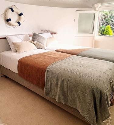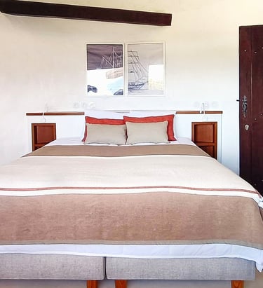 Upon entering, you are greeted by two beds, each positioned in front of a window that frames a stunning view of the sea. This window bathes the room in natural light and provides a mesmerizing, ever-changing seascape that adds a sense of tranquility and depth to the space.