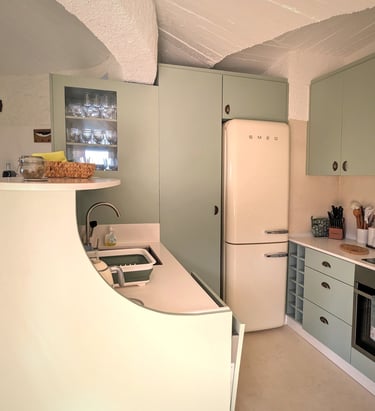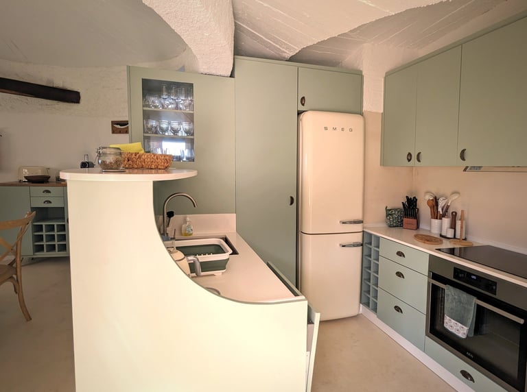 The kitchen has modern appliances for gastronomic explorations. A state-of-the-art SMEG refrigerator provides space for fresh ingredients. The sleek oven is ready to bake, and roast, while the built-in microwave above ensures convenience for quick, efficient cooking. With these tools at hand, the kitchen becomes an epicurean's playground for creating nourishing, delicious meals.
