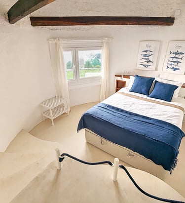 The "Indigo Milk" Mushroom has a serene bedroom, inspired by the vibrant Indigo Milk Cap mushroom. Descending a small spiral staircase, you find two beds adorned in deep indigo and soft white, reflecting the mushroom's striking colors.