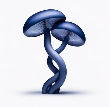 The "Indigo Milk" Mushroom has a serene bedroom, inspired by the vibrant Indigo Milk Cap mushroom. Descending a small spiral staircase, you find two beds adorned in deep indigo and soft white, reflecting the mushroom's striking colors.